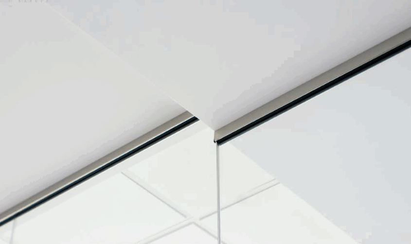 - Skla instalována do základových konzolí na stropu a zemi místností. Osazena vedle sebe přes bezbarvou těsnící pásku.